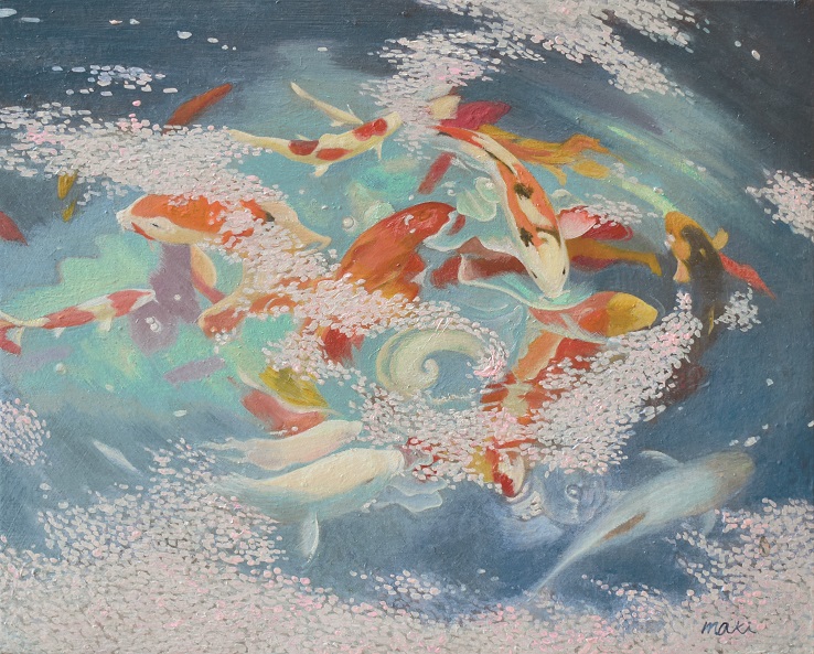 さてさて今日ご紹介ご紹介させていただく作品は「乱舞」F3号・油絵です。この作品は花筏の浮かぶ水面で遊ぶ錦鯉を描いた作品です(*´∇`)♪錦鯉は日本独特の文化だと思います。何代にも渡って鯉を養殖し、掛け合わせ掛け合わせそしてきれいな色を作り出す...そして生まれるのが錦鯉です。貴重なものでは数千万円?!にもなる鯉もいるのだとか?長岡が有名な養殖地です。